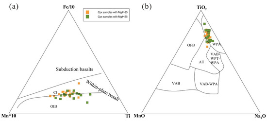Tectonic discrimination diagrams of Fe/10-Ti-Mn × 10 (a) and TiO2-MnO-Na2O tectonic discrimination diagram (b) for clinopyroxenes. The curve is based on Aparicio [67]. CI: alkaline volcanism thinned continental crust; OIB: oceanic island basalt. The TiO2-MnO-Na2O tectonic discrimination diagram is developed by Nisbet and Pearce [70]. WPT: within-plate tholeiitic basalt; WPA: within-plate alkali basalt; VAB: volcanic arc basalt; OFB: ocean floor basalt.