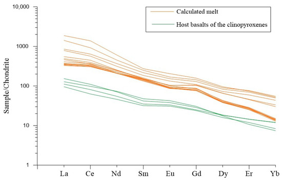 Calculated chondrite-normalized REE patterns of the parental magma of the clinopyroxenes (based on clinopyroxene compositions). Data for host basalts are from Yan et al. [26].