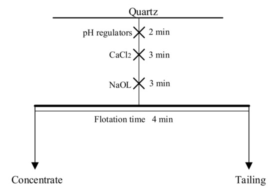 All flotation tests were carried out using an XFG flotation machine with a 40 mL cell operated at 1650 rpm. In three parallel tests, 35 mL deionized water and 2 g pure mineral sample were mixed and stirred [15]. Firstly, pH regulators were added to adjust the flotation pulp to the specified pH value in the subsequent 2 min. Secondly, the pulp was conditioned with CaCl2 for 3 min. Finally, a certain amount of NaOL was added into the cell with a 3 min conditioning time. The scraping operation lasted for 4 min and the concentrate was scraped out in the form of mineralized froth every 5 s. It should be mentioned that the addition of flotation agents would make the pH of the slurry fluctuate, so the pH regulators were discontinuously added to keep the pH of the slurry stable until 1 min before scraping. The products were filtrated, dried, and weighed, and the recovery was calculated based on the solid weight distribution among the two products [38]. The specific process of flotation tests is presented in Figure 2.