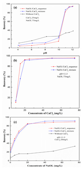 Quartz recovery as a function of pH (a), CaCl2 concentration (b), and NaOL concentration (c).