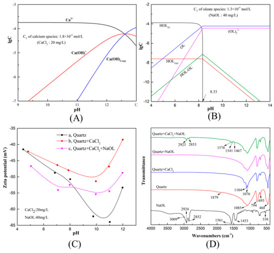 (A) Species distribution diagram of calcium ion as a function of pH; (B) species distribution diagram of oleate ion as a function of pH; (C) zeta potentials of quartz as a function of pH in the absence or presence of flotation reagents; (D) FTIR spectra of the quartz test sample with different conditions.
