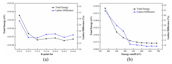 Figure 5b presents the total energy and lattice constants difference as a function of cut-off energy. As illustrated in Figure 5b, the total energy and lattice constants differences both kept decreasing to an equilibrium value with the increase of cut-off energy. Then, the decrease in total energy was lower than 0.05 eV and the reduction in the lattice parameters difference did not exceed 0.003% when the cut-off energy was beyond 571.4 eV. Therefore, the appropriate cutoff energy was selected as 571.4 eV.