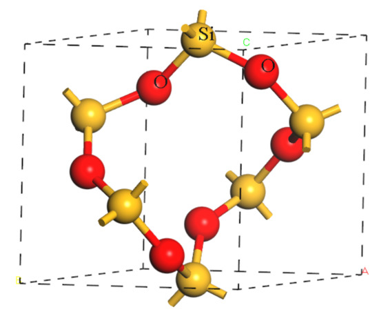 In conclusion, the rational parameters for quartz bulk cell optimization were determined as a GGA-PBESOL functional, k-point set 3 × 3 × 2, and a cutoff energy of 571.4 eV, which could generate a sufficiently accurate structure at an acceptable cost. The experimental conclusions basically tally with previous research results [12]. The optimized quartz bulk cell structure on the strength of optimum parameters is shown in Figure 6.