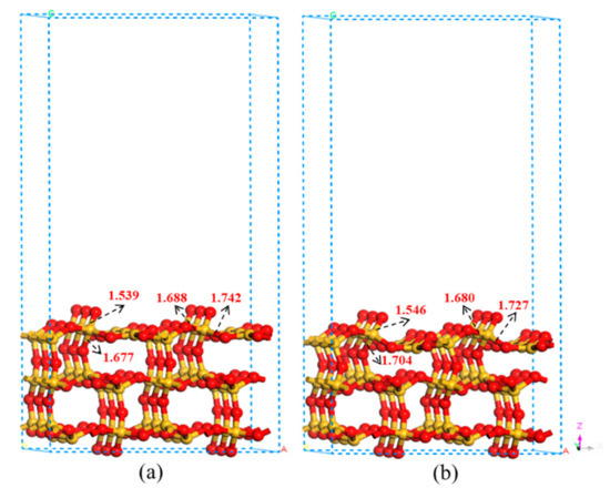 Quartz (101) surface structures: (a) original configuration and (b) optimized configuration (color codes: red—O, yellow—Si).