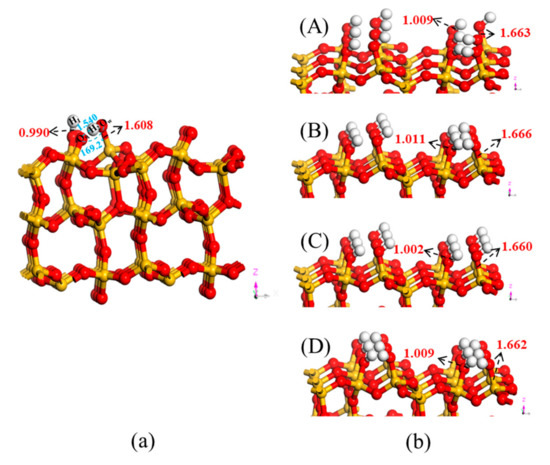 The initial cleaved (101) surface structure of the quartz is shown in Figure 7a, and its optimized structure at the GGA-PBESOL level is presented in Figure 7b. It can be seen from Figure 7 that the newly generated (101) surface structure will undergo a slight reconstruction to obtain a stable surface. Each Si atom was coordinated with four O atoms to form a tetrahedral structure, where the bond lengths of the Si–O bond formed by O atoms connected up and down with a Si atom extend from 1.539 Å to 1.546 Å and 1.677 Å to 1.704 Å, respectively, and the bond lengths of the Si–O bond formed by O connected left and right, with Si shortened from 1.688 Å to 1.680 Å and 1.742 Å to 1.727 Å, respectively. Before simulating the adsorptions of various adsorbates onto the quartz surface, the first consideration was to investigate the rarely reported hydroxylation behaviors of water molecules on the α-quartz (101) surface to more accurately describe the subsequent interaction mechanisms [36]. The hydroxylation reaction of the quartz (101) surface can be evaluated by the adsorption energy (Eads) of water on the quartz’s surface. The equation for adsorption energy (Eads) can be defined as the following [15]: Eads = Esystem – (Equartz(101) + EH2O), where Esystem represents the total energy of the optimized hydroxylated configuration of the H2O-absorbed quartz (101) surface, Equartz(101) and EH2O refer to the total energy of the optimized quartz (101) surface and optimized H2O molecules in the periodic structure, respectively. Firstly, individual water molecules are placed above unsaturated Si atoms on the quartz (101) surface. Due to the strong hydrophilicity of the quartz surface, it was found that H2O would spontaneously crack into H and OH, and separately combine with O atoms and Si atoms onto the quartz (101) surface after optimization. At the same time, one can easily find that two new Si–OH silanol groups were generated accompanied by the formation of Ow–H2···Oq hydrogen bonds with distance and bond angles of 2.598 Å and 169.2°, as illustrated in Figure 8a (note that Oq and Siq belong to the surface atoms of quartz; H1, H2, and Ow belong to the water molecule). The adsorption energy of a single water molecule on the quartz (101) surface was −501.4 kJ/mol, which indicates that the hydroxylation process was thermodynamically favorable. In consideration of the existence of six unsaturated Si atoms on the cleaved quartz (101) surface, six H2O molecules were placed directly above six different unsaturated Si atoms to explore the hydroxylation behaviors of water molecules on quartz. Figure 8b presents the optimized complete hydroxylation models of the quartz (101) surface with six water molecules adsorbed at the same parameter settings. The configuration A in Figure 8b is the original optimized hydroxylation model, and the other three possible configurations can be obtained in consideration of the symmetry of the system. Clearly, the bond lengths of the newly generated Oq–H and Siq–OH in the four hydroxylation models show little difference, but there is a significant diversity in the orientation of the bonds. The adsorption energy of the four different hydroxylation configurations of the quartz (101) surface is listed in Table 2. When all the O–H bonds on the surface of the quartz intersect with each other, the obtained configuration (i.e., configuration D in Figure 8b) has the lowest energy about −2517.8 kJ/mol, indicating that configuration D was the most stable in terms of thermodynamics.