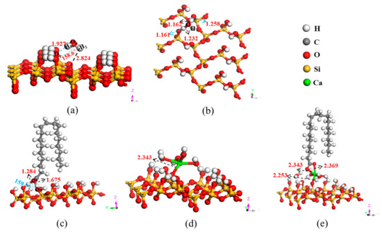 The optimized adsorption model of a water molecule on the hydroxylated quartz (101) surface (a), OH− ions on the hydroxylated quartz (101) surface (b), OL− on the hydroxylated quartz (101) surface (c), Ca(H2O)3(OH)+ ions on the hydroxylated quartz (101) surface (d), OL− on the previously activated structure (e).