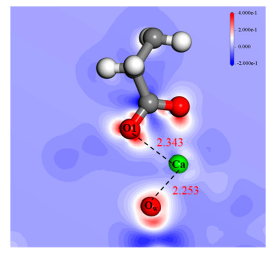 Figure 10 represents the electron density difference of OL− ion on Ca2+-activated hydroxylated α-quartz (101) surface. Obviously, the electron density of calcium atom decreased and the electron density of Ow and O1 atoms increased. The electron density of the overlap area between Ca and O atoms was very low, indicating a weaker covalency of Ca–O bonds, which accords with the lower bond population of Ca–O bonds. In terms of population analysis and electron density difference, it can be concluded that Ca atoms interact with the hydroxylated surface and OL− by ionic Ca–O bonds during the whole adsorption process, where Ca atoms serve as a bridge between the hydroxylated quartz (101) surface and NaOL collector [12].