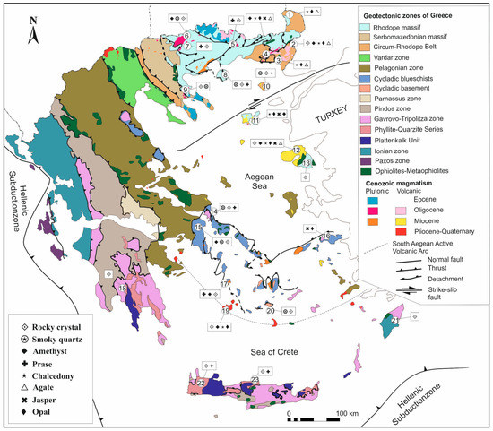 Occurrences of various gemstones in metamorphic and igneous rocks of Greece (Geological map of Greece modified after Ottens and Voudouris [17]): 1. Therapio/Evros, 2. Vyrsini/Evros, 3. Maronia/Rhodopi 4. Gorgona-Kimmeria/Xanthi, 5. Paranesti/Drama, 6. Trikorfo/Thassos, 7. Stratoni-Olympiada/Chalkidiki, 8. Fakos/Limnos Island, 9. Megala Therma/Lesvos Island, 10. Larissa, 11. Kymi/Evia Island, 12. Krieza-Koskina/Evia Island, 13. Petalo/Andros Island, 14. Ampelos/Samos Island, 15. Pounta/Ikaria Island, 16. Lavrion/Attica, 17. Kampos/Syros Island, 18. Agia Marina-Avessalos/Serifos Island, 19, Thapsana/Paros Island, 20. Kinidaros-Kavalaris/Naxos Island, 21. Kardamena/Kos Island, 22. Lakkoi/Crete Island.