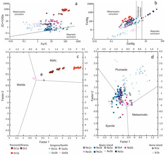 Greek corundum LA-ICP-MS analyses plotted on (a) (Cr+V)/Ga versus Fe/Ti discrimination diagram separating the fields for magmatic and metamorphic corundums (adapted from Sutherland et al. [40] and Harris et al. [41]; (b) Fe/Mg versus Ga/Mg discrimination separating the fields for magmatic, transitional and metamorphic corundums (adapted from Peucat et al. [42], Sutherland et al. [40] (both a and b are from Voudouris et al. [18]); (c) plot of Greek rubies (and Xanthi pink sapphires) within mafic rocks and marble field in discriminant factors diagram adapted after Giuliani et al. [43]; (d) plot of Greek sapphires within plumasite and syenite field in discriminant factors diagram adapted after Giuliani et al. [43].