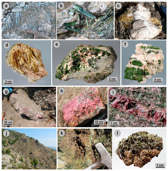 Field and hand specimens photographs demonstrating occurrences and crystals of gem-quality Al2SiO5-polymorphs and epidote-group minerals of Greece: (a–d) Blue, green to orange kyanite within metapelites and quartz veins at Trikorfo, Thassos Island; (e,f) Mn-rich andalusite (var. viridine) in quartz from Trikorfo, Thassos Island; (g–i) Pink-red, Mn-bearing zoisite/clinozoisite from Trikorfo, Thassos Island. (j) Epidote-bearing skarn of Lefkopetra, Kimmeria/Xanthi. Granodiorite is at the front of the photo; (k,l) Green epidote crystals associated with andradite from Lefkopetra; Photographs 6b,d,e,f,i,l are courtesy of Berthold Ottens.