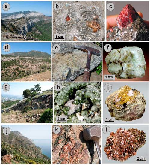 Field and hand specimens photographs demonstrating gem garnet occurrences/crystals of Greece: (a) alternating marbles and metapelites at Trikorfo, Thassos Island. Metapelites host spessartine together with other Mn-bearing silicates; (b) spessartine crystals associated with muscovite within quartz matrix; (c) spessartine within braunite-phlogopite bearing skarn from Thapsana. Paros Island; (d) Maronia skarn at the interface between marbles and the Maronia pluton (half right part of the photograph); (e) grossular crystals in contact with the Maronia monzogabbro; (f) partly transparent pale green grossular crystals from the Maronia skarn; (g) andradite-bearing wollastonitic skarn in contact with marbles, Kimmeria, Xanthi; (h) Green andradite and calcite from Kimmeria, Xanthi; (i) yellow andradite within amphibolite, Kimmeria, Xanthi; (j) Panoramic view of skarn at Dikeon Mt, southern Kos Island; (k) orange andradite and diopside from the Dikeon Mt skarn, Kos Island; (l) red-brown andradite with green quartz from Avessalos, Serifos Island. Photographs 7f,h,i,l are courtesy of Berthold Ottens.