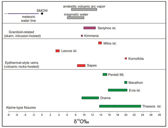 Volcanic-rock hosted amethysts yield isotopic δ18O values between 3.3‰ and 20.5‰ (Figure 9; see also Voudouris et al. [35]. Those from Kassiteres-Sapes show δ18O values of 8.2 to 10.5‰. The amethyst at Kornofolia, Evros district, yielded the highest δ18O values (20.5‰) and those from Lesvos the lowest δ18O value of all amethysts analysed (3.3‰). Finally, the Milos amethyst have δ18O values of 13.4 and 14.1‰. Based on fluid inclusion data, Voudouris et al. [35] suggested that most δ18O values correspond to a mixing of magmatic and oceanic (and/or meteoric) water, with the highest magmatic component in Kornofolia and the lowest in Lesvos Island.
