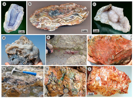 Field and hand specimens photographs demonstrating gem microcrystalline and amorphous silica varieties from Greece: (a) blue agate from Aetochori, Evros; (b) agate from Lefkimi, Evros; (c) chalcedony from Kornofolia, Evros; (d) blue chalcedony from Petsofas, Lesvos Island; (e) red jasper layer within smectite-altered pyroclastics, Sapes, Rhodopi; (f) red jasper from Sapes, Rhodopi; (g,h) brown and green opalized wood from Moudros, Limnos Island; (i) red opal from Agioi Theodoroi, Milos Island. Photographs 10a,c courtesy Berthold Ottens.