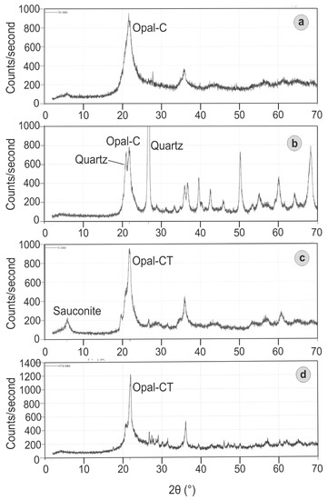 X-ray powder diffraction diagrams of various Greek opals (a,b) brown-orange opal-C and quartz from Lykofi Evros; (c) green opal-CT (color due to sauconite admixtures) from Sapes; (d) red-brown opal-CT from Moudros, Limnos Island.