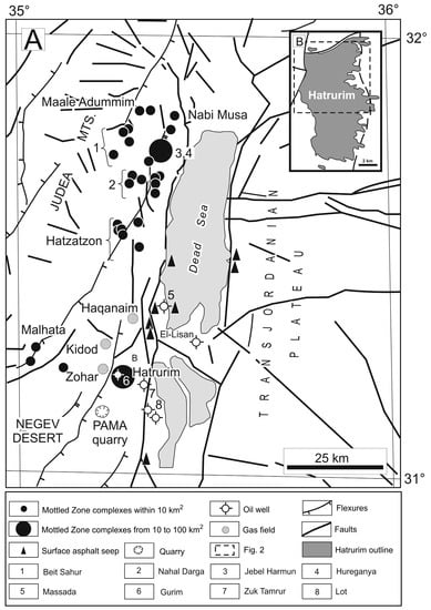 A) Generalized geology of the Dead Sea Transform area, with locations of Mottled Zone complexes, gas fields, asphalt shows, and oil wells, after [