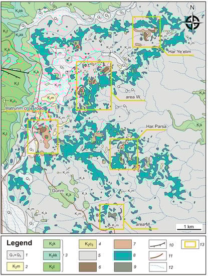 3) limestone, dolomite, and chalk; 5 = Low-grade Hatrurim Fm rocks; 6 = Larnite rocks (High-grade Hatrurim Fm rocks); 7 = “Olive rocks” (Hatrurim Fm); 8 = Spurrite marbles (medium-grade Hatrurim Fm rocks); 9 = Pseudo-conglomerates; 10 = Faults; 11 = Road;12 = Wadi; 13 = Sampling sites. Areas W and M are sampling sites of W and M series, respectively.