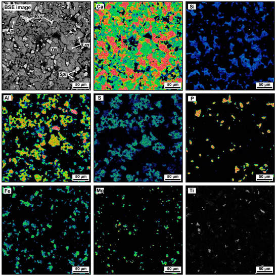 BSE image and elemental maps (Ca, Si, Al, S, P, Fe, Mg, Ti) of typical ye’elimite–larnite CM rock: uniformly distributed main, minor, and accessory phases. Sample MP-10-1. Mineral names are abbreviated as Ap = fluorapatite, Brm = brownmillerite, Lrn = larnite, Spl = spinel, Yel = ye’elimite.
