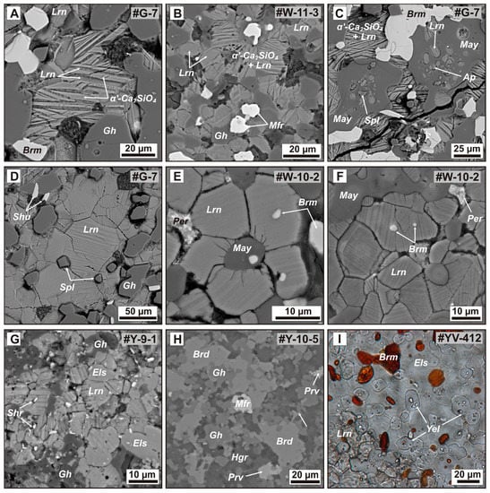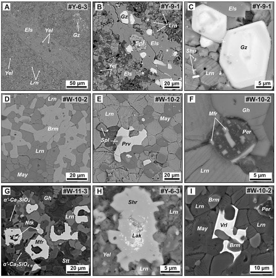 BSE images of accessory minerals in ye’elimite- and mayenite-bearing larnite CM rocks. Nest of anhedral grains (A) and small faceted crystals (B,C) of gazeevite associated with larnite, fluorellestadite, ye’elimite, shulamitite, and spinel. (D) Mosaic intergrowth of larnite and brownmillerite. (E) Anhedral segregation of perovskite and spinel grains in mayenite–larnite rock. (F) Magnesioferrite microinclusions in periclase. (G) Close association of magnesioferrite and nataliakulikite in gehlenite–larnite rock. (H) Ultrafine lakargiite inclusions in sharyginite. (I) Grains of vorlanite in interstitials between larnite, mayenite and brownmillerite. Mineral names are abbreviated as Brm = brownmillerite, Els = fluorellestadite, Gh = gehlenite, Gz = gazeevite, Lak = lakargiite, Lrn = larnite, May = mayenite supergroup minerals, Mfr = magnesioferrite, Ntk = nataliakulikite, Per = periclase, Prv = perovskite, Shr = sharyginite, Spl = spinel, Vrl = vorlanite, Yel = ye’elimite.
