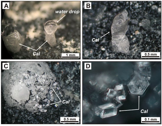 Products of experimental hydration of larnite CM rocks placed in a closed desiccator together with a water-filled vessel. A, B: calcite tube with a drop of water condensed (A) on its top and evaporated (B). (C,D) crust and individual crystals of fine calcite on the surface of hydrated larnite rocks kept for three to seven months in the desiccator. Cal = calcite.