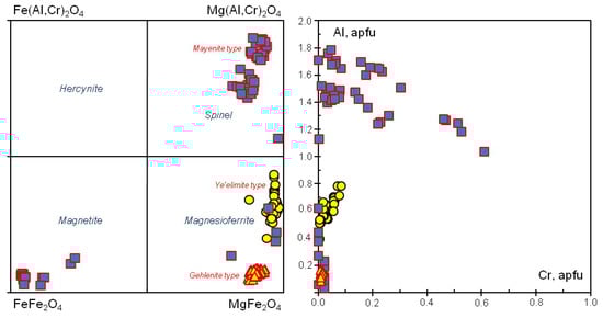 Composition variations of spinel-group minerals from the Hatrurim larnite CM rocks. Circles, squares, and triangles are ye’elimite–, mayenite–, and gehlenite-bearing larnite rocks, respectively.