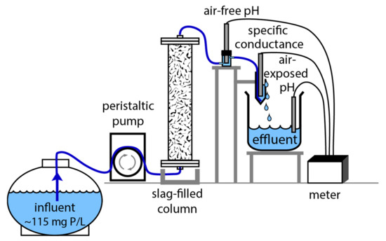 The experimental setup for the column experiments consisted of a reservoir with influent, Ismatec peristaltic pumps, clear acrylic columns, flow-through cells, electrodes, a meter, and beakers (Figure 1). Two slag samples (AMFeC and ILSS5) were further crushed to <4.75 mm to ensure adequate flow within columns (inner diameters of 5 cm, length of 23.5 cm, volume 510.5 cm3). Samples were also sieved to >0.5 mm to remove fines to avoid clogging. Splits of these sieved samples were also characterized for mineralogy and chemistry based on the methods described above in Section 2.2. The column was packed with approximately 100 g splits of slag funneled into the column in a circular direction to create non-stratified layers. Both ends of the column were sealed with Viton O-rings. Nitex (next to the sample) and Porous Polyeth Sheet (35 μm) screens were placed at the bottom and top of column endplates to prevent flushing of solids from the column. Four columns were packed, two with the modern slag (columns A and B) and two with the legacy slag (columns C and D). Columns B and C were used for the tracer tests and columns A and D were used for the phosphate removal experiments.