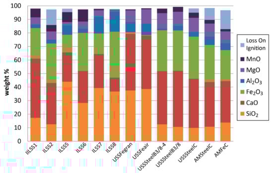 Several minor or trace elements were found in minor but significant amounts, on the order of hundreds to thousands of mg/kg. For example, Cr concentrations ranged from 0.01 wt. % up to 0.8 wt. % Cr, with the highest concentrations for slag collected from two legacy sites (ILSS2 and ILSS6). Titanium was also present and ranges from 0.2 to 0.6 wt. %. The following elements were generally found in concentrations in the hundreds of mg/kg: Ba (41 to 1430 mg/kg), Pb (0.5 to 570 mg/kg), Sr (117 to 364 mg/kg), and V (56 to 1410 mg/kg). The concentrations of other elements were generally less than 100 mg/kg [31].