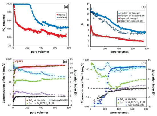 Based on geochemical modeling, and observed precipitates and secondary coatings, the formation of Ca phosphate phases was the main mechanism for phosphate removal as the column experiment progressed. As shown in Figure 7, other phosphate phases containing both Ca and other cations were identified based on SEM. These phases, potentially amorphous to crystalline equivalents of phosphate minerals such as vivianite, whitlockite (Ca(Mg,Fe2+)(PO4)6PO3OH), and parascholzite (CaZn2(PO4)2∙2H2O), may not be represented in the thermodynamic database and, therefore, were unable to be modeled. Other mechanisms may drive phosphate removal prior to direct phosphate precipitation and require further investigation. The high amount of Fe in the slag present as Fe-oxides, mainly wüstite and magnetite, may play a role in phosphate removal. Sellner et al. [47] reported that steel chips and iron filings remove phosphate more effectively than natural minerals and steel slag and attributed the removal to surface complexes, electrostatic adsorption and Fe-phosphate precipitation. A secondary Ca- and Fe-phosphate mixed phase was identified on reacted slag from the legacy-slag-filled column (Figure 7b). In addition, calcite actively precipitated from effluent generated in the modern slag column for approximately the first 240 pore volumes, generally the same duration that brushite and octacalcium phosphate were undersaturated. During these initial pore volumes, primary Ca phases in the slag and secondary calcite may have provided sorption sites for phosphate. According to Bowden et al. [6], absorbed phosphate on calcite may form nucleation sites from which precipitation of Ca phosphates may occur; however, limited sites are likely available on the calcite. Further, most of the secondary calcite began forming only after the effluent was exposed to atmospheric CO2. Iron phases in the slag may also provide sorption sites; however, sorption of phosphate would likely be limited under these high-pH conditions [48,49]. Additionally, phases not in the thermodynamic database such as amorphous Ca phosphate, Ca-phosphate-carbonates, or Ca-deficient hydroxylapatite may also play a role.