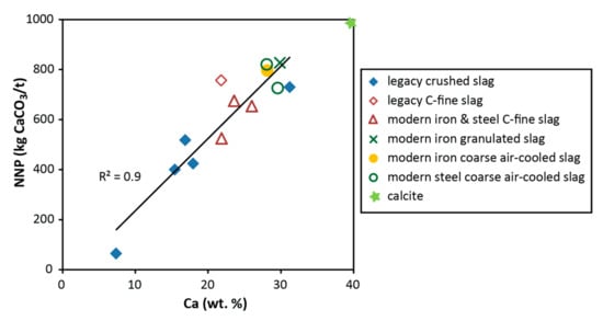 ABA suggests that modern and legacy iron and steel slags are extremely alkaline materials with the potential to be used to neutralize acid. The high paste pH (10 to 12.5), which is a measurement of the equilibrated (i.e., steady) pH of a deionized-water-saturated sample, and the pH (9.7 to 12.3) of the SPLP leachate solutions (i.e., reacted for 18 h) were similar and positively correlated (R2 = 0.9), suggesting the shorter-term reaction test (paste pH) is a good indicator of the longer-term (on the order of hours to a day) simulated weathering behavior of these samples. The alkaline pH of the reacted solutions and the high neutralization potentials of up to 860 kg CaCO3/t are the consequence of various mineral dissolution reactions during the ABA procedure. The NP and NNP values both positively correlate (R2 = 0.9) with the amount of Ca in the slag (Figure 4). As previously mentioned, the neutralization generated by the slag samples reached over 80% of the theoretical neutralization generated by pure calcite (i.e., 1000 kg CaCO3/t) (Figure 4). The Ca minerals present in these slag samples in major (over 10 wt. %) to minor (1–10 wt. %) amounts based on XRD include calcite (CaCO3), lime (CaO), larnite (Ca2SiO4), åkermanite–gehlenite (melilite group) (Ca2Mg(Si2O7) to Ca2Al(AlSiO7)) and brownmillerite–srebrodolskite (Ca2(Al,Fe)2O5 to Ca2Fe2O5), among others. The Ca-bearing minerals may consume acid during hydrolysis, explaining the correlation between pH and Ca content. The following are dissolution reactions for several of the Ca minerals found in the slag:
