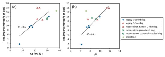 Results from batch experiments using initial leachant phosphate concentration of 1085 mg P/L on slag from the Chicago-Gary area, Illinois and Indiana. (a) Phosphate removal capacity (PRC) versus bulk calcium (Ca) concentrations in weight percent (wt. %). (b) PRC versus pH of the reacted effluent solution. The linear regression line and coefficient of determination (R2) are also indicated.