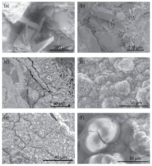 Secondary electron (a) and backscattered electron (b–f) scanning electron micrographs of reacted slag from phosphate removal column experiments using ferrous slag from the Chicago-Gary area, Illinois and Indiana. Some phases were confirmed by XRD. (a) Tabular brushite on reacted ILSS5. (b) Tabular Ca phosphate and finer-grained radiating rosette-shaped plates of Fe, Ca and phosphate on reacted ILSS5. (c) Layers of Ca phosphate coatings, some with trace amounts of Mn and Mg, on reacted ILSS5. (d) Radiating rosette-shaped plates of hydroxylapatite on reacted AMFeC. (e) Worm-like morphology of Ca, Mg and phosphate on reacted AMFeC. (f) Fibrous nodule morphology of Ca, Zn and phosphate on reacted AMFeC.