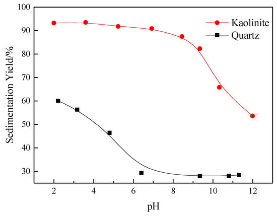 Figure 2 shows the effect of pH on the sedimentation and aggregation behaviors of kaolinite and quartz. As shown, the kaolinite particles exhibited a strong aggregation from an acid to natural pH, and their sedimentation yields were consistently above 90% in a wide pH range of 2–8. Compared with kaolinite, the sedimentation yields of the quartz particles were quite low, and decreased further from 60% to 25% when the solution pH was increased from 2 to 12. In alkaline conditions, both minerals exhibited dispersion behaviors; however, the quartz particles were dispersed significantly more than the kaolinite ones.