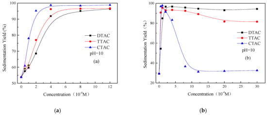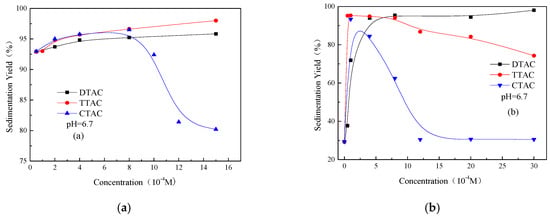 Figure 4 shows the effect of different concentrations of three quaternary ammonium salts on the sedimentation behavior of kaolinite and quartz at pH 10. As can be observed in Figure 4a, the sedimentation yield of the kaolinite particles was increased with the increasing concentration of all three of the quaternary ammonium salts. However, at a concentration above of 4 × 10−4 M, the sedimentation yield remained stable and unchanged. However, if the concentration is kept constant, the carbon chain length of the salts becomes the defining factor for the sedimentation yield of kaolinite, and can be placed in the following order of effectiveness: CTAC > TTAC > DTAC.