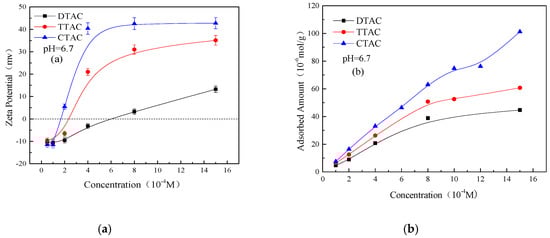 Zeta potentials (a) and adsorbed amounts (b) on the quartz surface as a function of different concentrations of quaternary ammonium salts at pH 6.7.