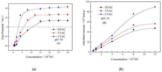 Figure 4b reveals that the influence of three quaternary ammonium salts on the dispersion and aggregation behaviors of quartz at pH 10 was the same as that observed at pH 6.7 (Figure 3b). However, compared to the results shown in Figure 3b, it can be observed that the concentrations of CTAC required for the complete dispersion were decreased from 1.2 × 10−3 M to 8 × 10−4 M. These results show that, at an alkaline pH, the quartz particles exhibited a strong aggregation, even at lower concentrations of DTAC. However, when the concentration of CTAC was reached at 8 × 10−4 M, the dispersity of the quartz showed a great improvement. Finally, the CTAC concentration required for the complete dispersion of the quartz particles was lower than that observed under neutral conditions.