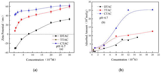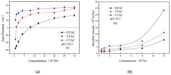 Figure 6 shows the Zeta potentials and adsorbed amounts on the kaolinite surface as a function of the different concentrations of quaternary ammonium salts at alkaline conditions. It can be observed, that the increasing concentration of all three salts increased both the Zeta potentials and their amount of adsorption on the surface of kaolinite. However, compared with neutral conditions (Figure 5a), the adsorbed amount of salts at alkaline conditions was much larger. The greater adsorption of salts at alkaline conditions was mainly due to the highly negative surface of kaolinite, while at neutral conditions, the kaolinite surface was positive, which electrostatically repulsed the surrounding salts.