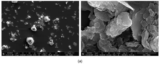 The SEM micrographs of kaolinite in the presence of quaternary ammonium salts at different pH conditions are shown in Figure 10, Figure 11 and Figure 12. As the aggregation occurred via the basal or edge planes of the kaolinite structure where the adsorption energy of quaternary ammonium salts on the (001) face is lower than that of the (00) face. Thus, the effect of the quaternary ammonium salts on the (001) face under the effect of special affinity can be seen from Figure 10.