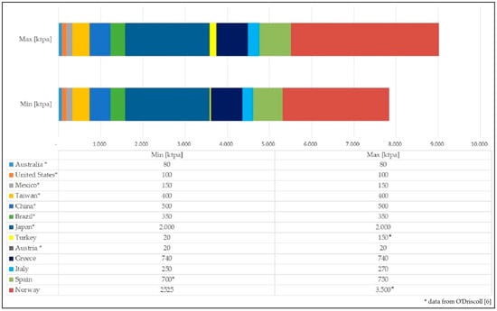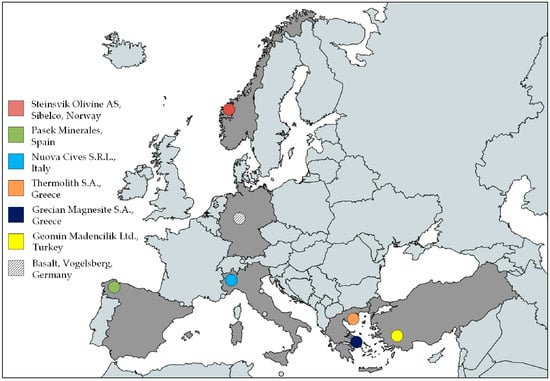 Norway, Spain, Greece, Italy, and Turkey are major olivine producing countries in Europe, with a total amount of between 4200 to 5400 ktpa, which represents more than 50% of the global olivine production of 7800 to 9000 ktpa (Figure 2). The production numbers differ due to published data from O’Driscoll [6] from 2004 and the current numbers from the producers of the investigated samples. The annual production of the seven peridotite producers in Europe plus the Horoman Mine in Japan, which were examined in the CO2MIN project account for 4595 ktpa, which is between 51% and 58% of the global peridotite production.