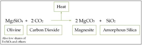 As shown by the example of olivine samples within the present study, many parts of Europe, and also Asia, possess mineral resources that are capable of significant carbon dioxide sequestration. Vicariously for regions not exhibiting such olivine deposits, a basalt sample from Germany was also taken into consideration, which merely contained minor fractions of magnesia-rich phases that were found to have larger relevance within the evaluation of the minerals’ carbonation potential. Nevertheless, countries, such as Germany, exhibit secondary resources as steel slags, fly ashes, and filter ashes bearing potential for CO2 sequestration due to their high CaO content. Kelemen et al. have pointed out that mantle peridotite is capable of consuming more than one billion tons of CO2 per year, in Oman alone, forming reaction products as MgCO3 and CaCO3 by an industrial acceleration of natural peridotite weathering [18].