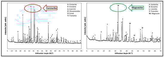 Which of the magnesia-rich phases constituting the main parts of the examined olivine samples, forsterite or enstatite, exhibits the better performance within the carbonation process and whether the mere presence of further mineral phases affects the overall carbonation potential, has to be investigated in future studies. Although the complete carbonation of a synthetic magnesia material to magnesite in a previous step of the study proves the capability of the process, the effects hindering or slowing down the carbonation reaction of magnesia containing phases as Enstatite have to be understood in detail. [1] However, at this stage of the project, the first results that were gathered by Stopic et al. are pointing to forsterite as the more reactive mineral phase within the carbonation process, as shown by the processing and examination of e.g., Norwegian and Italian olivine samples [1,17]. The next steps are the comparison of the products after carbonation of selected input material, separation of the carbonation products, and also the investigation of residual materials, like slags, fly ash, and red mud as the possible input materials for the sequestration process.