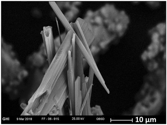 Still, the investigation by Scanning Electron Microscopy (LEO Type 440i, Leo Electron Microscopy, Cambridge, UK) reveals acicular material (Figure 5), which makes the careful handling of these materials indispensable. It is also indicated that the given carbonation parameters are not capable of enabling a complete reaction process from tremolite to magnesite. Nevertheless, fibrous tremolite has not been observed in the Italian olivine samples, which does not exclude this material from subsequent processing and analysis steps.