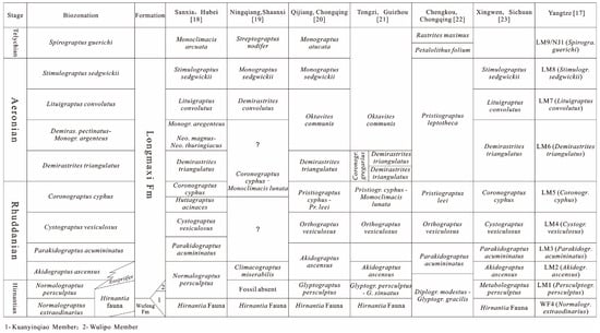 The Yangtze fossil zonation of the Ordovician and Silurian extinctions has been well studied, and the zonation is slightly different in the study area (Figure 1). This paper discusses the zonation by referencing the Stratigraphic Chart of China [] to compare the zonation in different regions. Chen Xu et al. [] designed a classification based on graptolite zonation for Wufeng Formation and Longmaxi Formation (WF1-WF5, LM1-LM9), which is applicable and the zonation can be well compared with the Stratigraphic Chart.