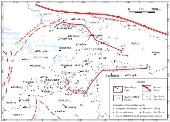 Distribution of investigated and reference points.Investigated points: I—Guanyinqiao, Qijiang, II—Dafeng’ao, Shizhu, III—Changning, Yibin, IV—Gongxian, Yibin, V—Bailu, Wuxi, VI—Tianba, Wuxi, VII—Fenxiang, Yichang, VIII—Bixi, Longshan, IX—Tianping, Fenggang, X—Yinjiawan, Yongshan, XI—Sanquan, Nanchuan, XII—Dayou, Nanchuan, XIII—Well WX2. Reference points: 1—Daozimiao, Jingshan []; 2—Wangjiawan, Yichang []; 3—Laifeng, Sanbaoling []; 4—Gaoluo, Xuan’en []; 5—Taiyanghe Enshi []; 6—Siyangqiao, Badong []; 7—Qingquan, Shennongjia []; 8—Laomatou, Zhushan []; 9—Qilinxiang, Xingwen []; 10—Fucheng, Nanzheng []; 11—Xihe, Nanzheng []; 12—Sanlangpu, Xixiang []; 13—Xingzishan, Zhenba []; 14—Zihuang, Ziyang []; 15—Datangkou, Chengkou []; 16—Longjingpo, Wuchuan []; 17—Longchihe, Shimen []; 18—Heshui, Yinjiang []; 19—Sigou, Shiqian []; 20—Leijiatun, Shiqian []; 21—Wenjiadian Sinan []; 22—Dongkala, Fenggang []; 23—Dazhongba, Yibin []; 24—Xinglong, Luding []; 25—Taiping, Gulin []; 26—Yanzikou, Bijie []; 27—Yangliugou, Huairen []; 28—Sanhuai, Xishui []; 29—Shizipu, Zunyi []; 30—Banqiao, Zunyi []; 31—Songkan, Tongzi []; 32—Liangfengya, Tongzi []; 33—Hanjiadian Tongzi []; 34—Liaoyuan, Tongzi []; 35—Ganxi, Yanhe []; 36—North of Shiqian []; 37—Zhoujiaba, Yinjiang []; 38—Ludiping Songtao []; 39—Huoshaoqiao, Guizhou []; 40—Rongxi, Xiushan []; 41—Niuchang, Meitan []; 42—Changyang, Yinchang []; 43—Dalianghui, Wangcang []; 44—Houjiayuan, Ningqiang []; 45—Zhaojiaba, Ningqiang []; 46—Maopinggou, Ningqiang []; 47—Qiaoting, Nanjiang [];48—Linxiang, Hunan []; 49—Goujiaya, Yuan’an []; 50—Huanggexi, Daguan []; 51—Weiyuan, Sichuan []; 52—Changjianggou, Guangyuan []; 53—Qilixiang, Guangyuan []; 54—Dahe, Dujun []; 55—Shuizhu, Kaili []; 56—Wudang, Guiyang [].
