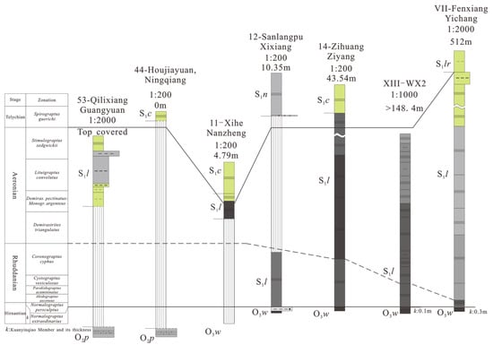 Two profiles, the north (53-44-11-12-14-XIII-VII) and south (I-33-30-41-20-18-40-VIII-48), were selected to represent the graptolite development and lithological association in the four target regions to illustrate the sedimentary environment change (Figure 2). These two profiles are representative in elucidating the change of environment as the profiles run along the margins of the uplifts involved.