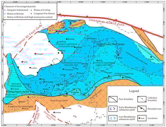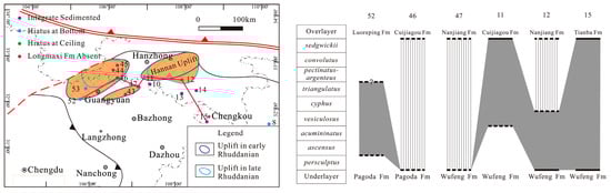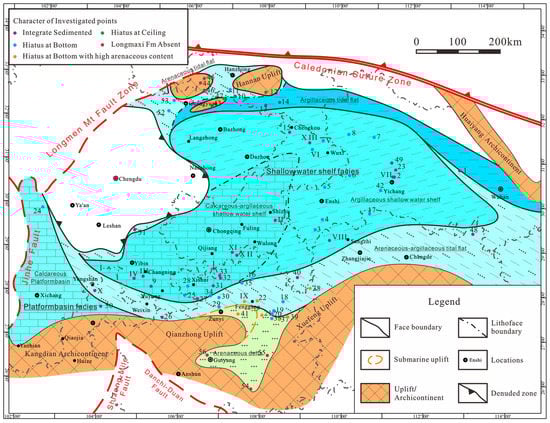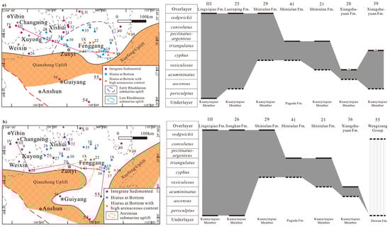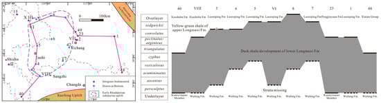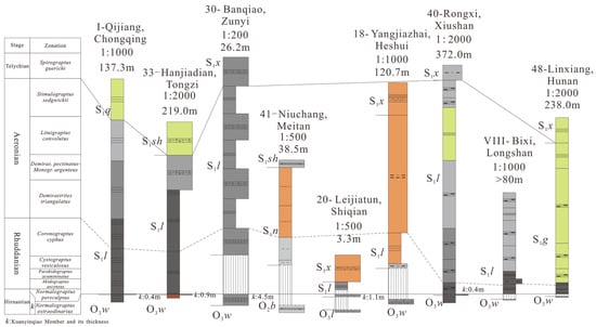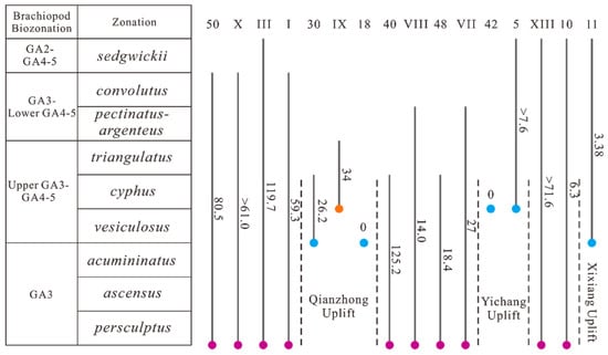 The lithological characteristic and fossil zonation analysis along the southern Yangtze clearly represents the transition of the Qianzhong uplift (Figure 5). Wudang, Guiyang (Point 56) lies on the south of the Qianzhong uplift (Figure 6), and late Aeronian Gaotianzhai Formation, whose lithology is fuchsia calcareous-breccia silt, overlies the middle Ordovician Huanghuachang Formation directly without early Silurian sediments [,]. North of Point 56, it was brown-yellow silty shale and gray shale, for instance Meitan, Sinan (Point 41), and the fossils were mainly branchiopod with few graptolites, which was quite different from the Longmaxi Formation. This indicated normal shallow water near the shore, and the formation was named the Niuchang Formation after detailed studies, isochronous to deposition during the Rhuddanian C. vesiculosus zonation to Aeronian D. triangulates [,]. On the east of Northern Guizhou, zonation in Wufeng and the bottom of Longmaxi was missing at Point 20 and 21, while the Kuanyinqiao limestone was well developed, and at Point 21 there is irony weathering crust on the Kuanyinqiao limestone [,]. The weathering crust also existed at Point XI, and the thickest Kuanyinqiao limestone (11 m) was reported near Point XI []. To the northwest, the missing zonation narrowed down, and at Point 25 and 28 only the last zonation of Hinantian (N. persculptus zonation) was missing.
