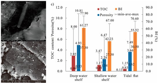 The lower member of the Longmaxi Formation developed in euxinic deep-water, and it is of high TOC and quartz content. Large quantities of organic matter would form considerable micropore space during thermal evolution, meanwhile the abundance of graptolite fossil correlated well with TOC content, which could form sheet-like pores along the bedding (Figure 11a,b) []. The high silica content is related with biogenetic factors and volcanic activities [,]. The upper member, which formed under shallow-water shelf or tidal flat environments with a lower reduction degree is of relatively lower TOC content, and the calcareous or sandy laminae are alternately layered with organic matter enriched ones (Figure 11c). Upper members forming closely around the uplifts kept a high brittleness and porosity, for example, at Point IX, the debris content near the ceiling of Longmaxi Formation can be 32%.