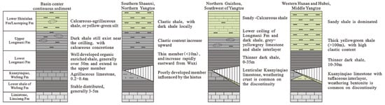 - Su, W.; Li, Z.; Ettensohn, F.R.; Johnson, M.E.; Huff, W.D. Distribution of Black Shale in the Wufeng-Longmaxi Formations (Ordovician–Silurian), South China: Major Controlling Factors and Implications. Earth Sci. 2007, 6, 819–827. [Google Scholar]