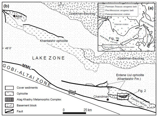 (a) Simplified tectonic map of the Central Asian Orogenic Belt and adjacent cratons (modified after Jahn et al. [8]); (b) Simplified tectonic sketch map of the Lake Zone (modified after Javkhlan et al. [28]).