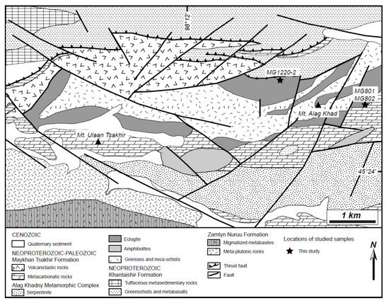 The Chandman district, located in the southeast part of the Lake Zone, is composed of four major geologic units (Figure 1b). Neoproterozoic ophiolites of the Khantaishir Formation (Erdene Uul ophiolite) [26] occur in the north. High-pressure metamorphic rocks including eclogites of the Alag Khadny Metamorphic Complex are interleaving with Maykhan Tsakhir Formation marbles in the central part of the district and both units are interpreted as a tectonic mélange [15]. The Maykhan Tsakhir Formation is considered as former passive margin sediment [26,27] and contains lenses of garnet-chloritoid schists located close to the contact with the eclogite body [28]. The Zamtyn Nuruu Formation crop out in the south has been interpreted as a basement block consists mainly of migmatized orthogneiss, amphibolites, metagabbro, and paragneiss [17]. Contacts of all these units are tectonic or tectonized [15]. The Zamtyn Nuruu Formation is overthrusted by both the Alag Khadny Metamorphic Complex and the Maykhan Tsakhir Formation, which themselves are overthrusted by the Khantaishir Formation (Erdene Uul ophiolite) [15,26].