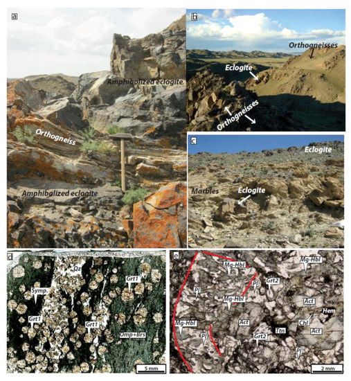 view of the outcrops in the Chandman district. (a) Orthogneiss interleaved with amphibolitized eclogite body (MG1220-1); (b) the orthogneiss surrounding eclogite body and (c) small lens of eclogite body enclosed in the marble; (d) Photomicrograph of the relatively fresh glaucophane-bearing eclogite (MG802) consists mainly of garnet (Grt1), omphacite, and barroisite. Compositionally different layers developed along the schistosity in the eclogite sample as composed of quartz-rich and quartz poor mafic layers; (e) Photomicrograph of the amphibolitized eclogites consist mainly of amphiboles (actinolite, Mg-hornblende), plagioclase, and garnet. Red lines indicate boundary zone of symplectitic assemblage consisting intergrowth of plagioclase and Mg-hornblende. Larger amphiboles have zoning with paler colored cores with greenish colored rims. Abbreviations: Symp, symplectite; Grt1, garnet1; Grt2, garnet2; Omp, omphacite; Brs, barroisite; Qz, quartz; Mg-Hbl, Mg-hornblende; Pl, plagioclase; Act, actinolite; Ttn, titanite; Hem, hematite.