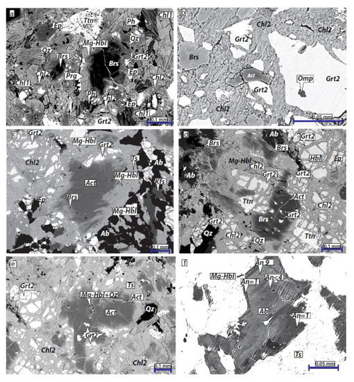 images from the amphibolitized eclogite (MG1220-2). (a) A large grain zoned amphibole coexist with phengite (Ph), chlorite (Chl1), epidote (Ep), and titanite (Ttn). Amphibole have a core of barroisite with overgrown rim zoned with Mg-hornblende and pargasite. Relics of fragmental garnets (Grt2), amphibole and darker flakes of Chl1 are surrounded by fine-grained aggregates of chlorite (Chl2); (b) Fragmental garnet (Grt2), barroisite, actinolite are surrounded by Chl2. Grt2 contain inclusion of omphacite (Cpx1); (c) Resorbed core zoned with actinolite to barroisite overgrown by Mg-hornblende and tschermakite (Ts). Discrete anhedral and subhedral smaller Mg-hornblende are forming symplectite texture together with plagioclase and K-feldspar; (d) Partially resorbed core of amphibole contains inclusions of fragmental garnet (Grt2). During the resorbtion Chl2 surround the amphibole and infiltrated into the core of amphibole and partially replaced inclusions of Grt2. Amphibole zoned as barroisite resorbed core with Mg-hornblende rim. Albite (Ab), epidote, and quartz coexist with Mg-hornblende. Thin actinolite micro-vein cross cut zoned amphibole; (e) Fragmental garnet (Grt2) strongly replaced by Chl2. Core of actinolite contain symplectitic polyphase inclusion of Mg-hornblende and quartz, probably indicating former omphacite; (f) Symplectitic plagioclase have a zoning with anorthite content increase from the core (An = 4) to the mantle (An = 9) and decrease from the mantle to the rim (An = 1).